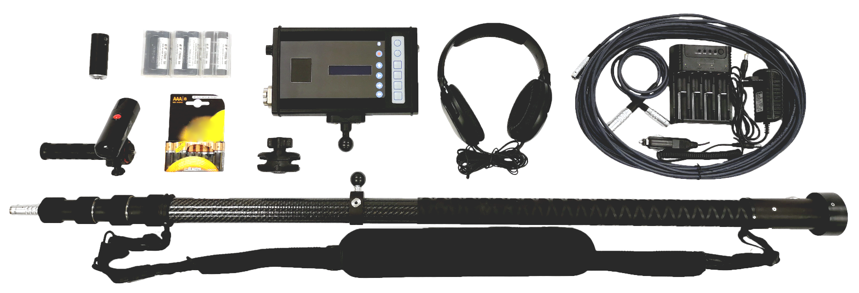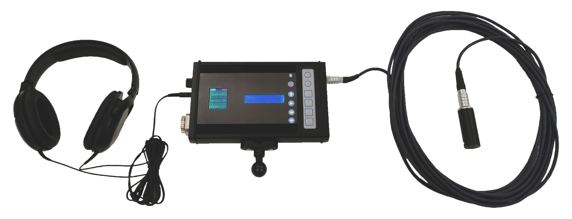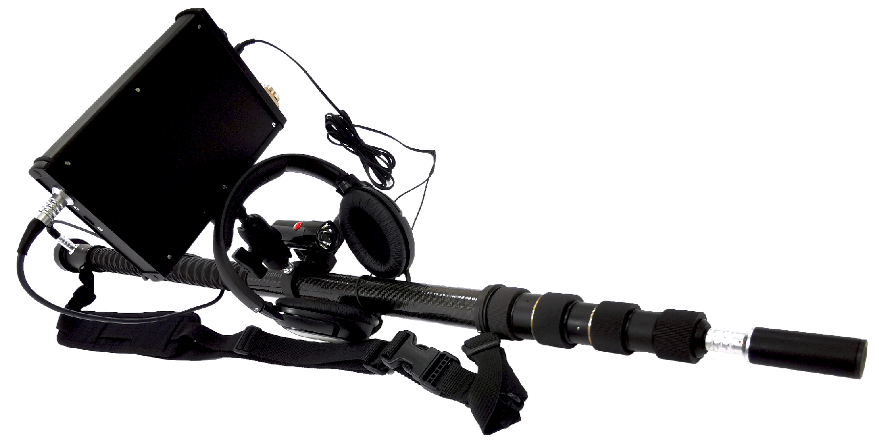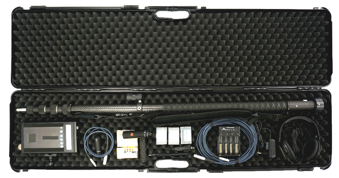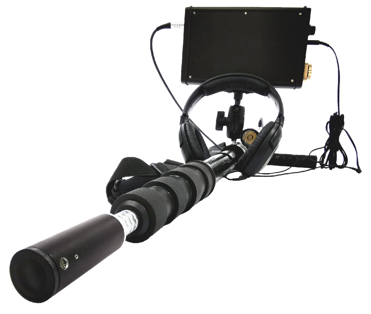 Акустический датчик, закрепленный на телескопической штанге или удлинительном кабеле фиксирует аудиосигналы и передает их на блок обработки сигналов с подключенными наушниками.