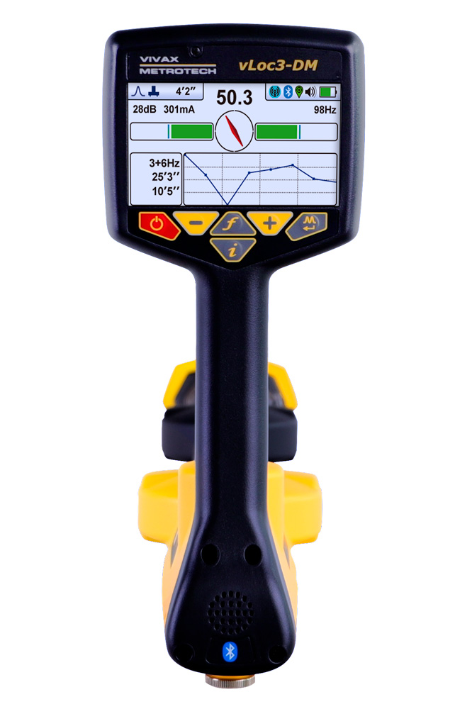 С помощью двух комплектов 3D-антенн искажение сигнала легко обнаруживается и отображается на ярком цветном антибликовом дисплее. vLoc3-DM имеет новый перспективный экран отображения вектора для полностью автоматического поиска без перемещения, экран графика поперечной схемы, показывающий одновременно пиковые и нулевые значения, обеспечивающие незамедлительное измерение искажения сигнала, и экран вида сверху (вид план), показывающий относительную ориентацию коммуникации под любым углом. Визуальные и механические (вибрации) оповещения могут быть настроены пользователем для предупреждения о малой глубине, перегрузке, воздушных линиях и чрезмерном отклонении.