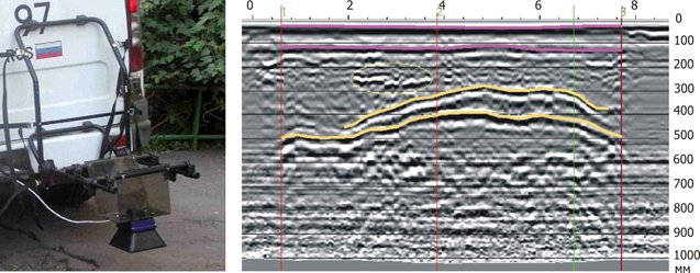 Пример радарограммы, полученной георадаром ОКО-2 с антенным блоком АБ-1700Р при изучение конструктивных особенностей автодорожного покрытия.